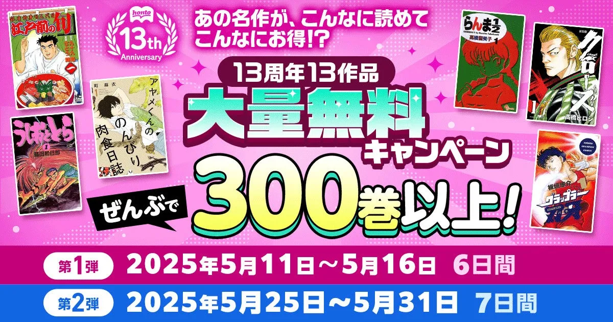 大日本印刷が運営するハイブリッド型総合書店「honto」が、開業から13周年を迎えました。それを記念して、2025年5月11日から大型の無料キャンペーンを実施することが発表されました。これにより、人気の漫画や名作が日替わりで無料で楽しめるチャンスが提供されます。