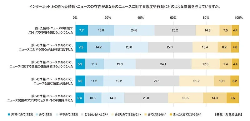 約48.3%の人々が、誤った情報やニュースの存在によってストレスや不安を感じていると答えました。また、ニュースへの関心が低下した人数は44.4%にのぼり、議論を避けるようになったという人も36.8%に達しました。これは、情報環境の健全性に対する警鐘とも言えるでしょう。