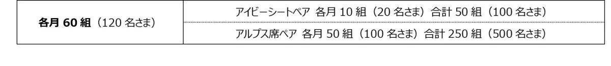 - - 公式戦ペア観戦チケット: 毎月60組を用意