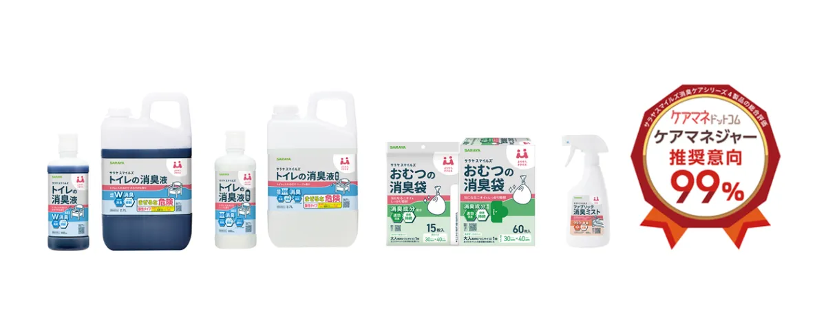 このたび、サラヤスマイルズの消臭ケアシリーズである4製品が、「ケアマネドットコム」にてケアマネジャーから高い評価を受け、「ケアマネジャーの推奨意向99%」という素晴らしい結果を見せました。具体的な製品は以下の4つです: