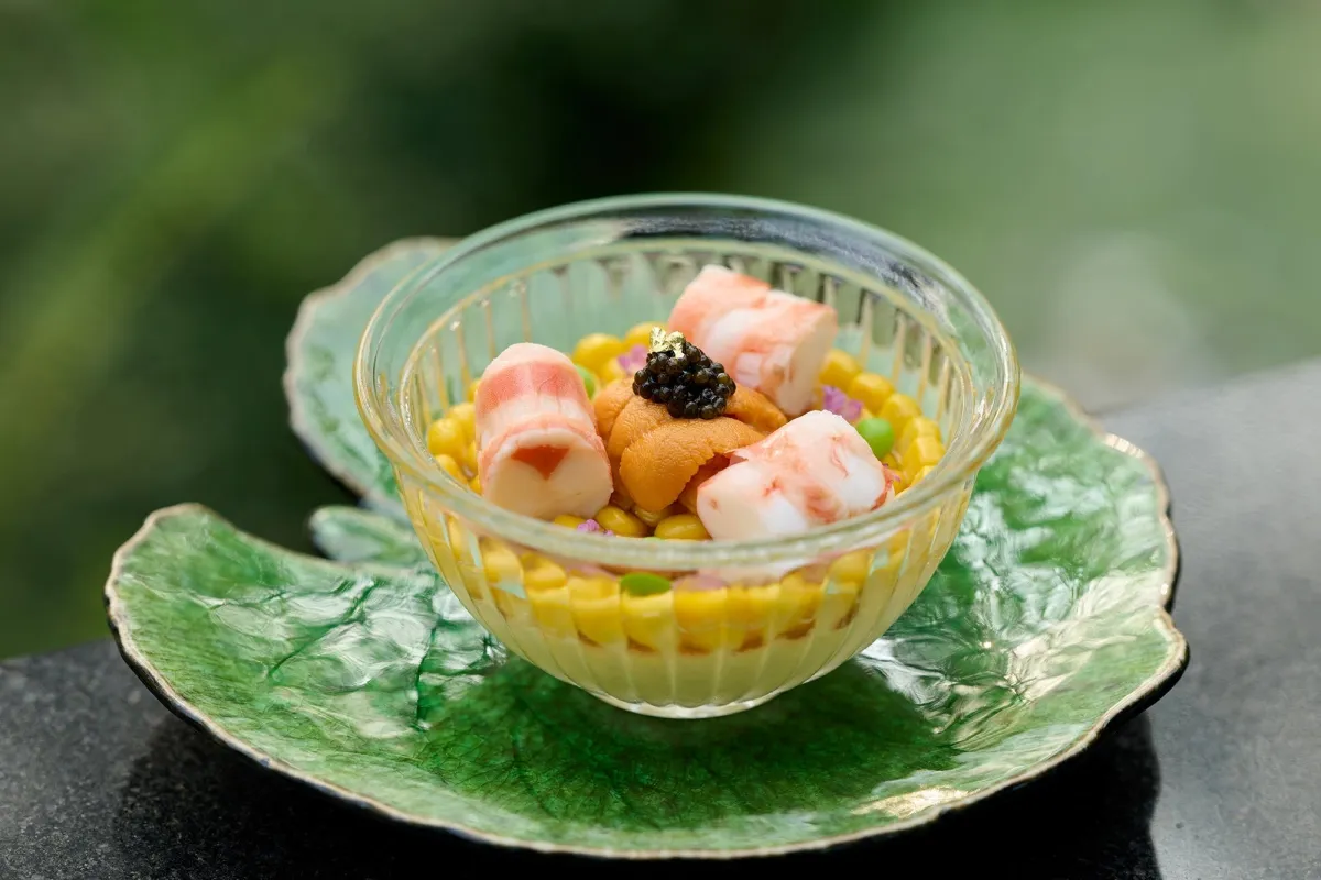 トウモロコシの甘味が存分に引き出された一品。日本の伝統的な「玉地蒸」の技法を用い、蒸したトウモロコシを皮ごと潰し、カシューナッツを加えることでコクを増しています。この料理は、モチモチとした食感と滑らかな食感が互いに引き立て合っており、春の到来を告げる美しい色合いが見た目にも楽しませてくれます。
