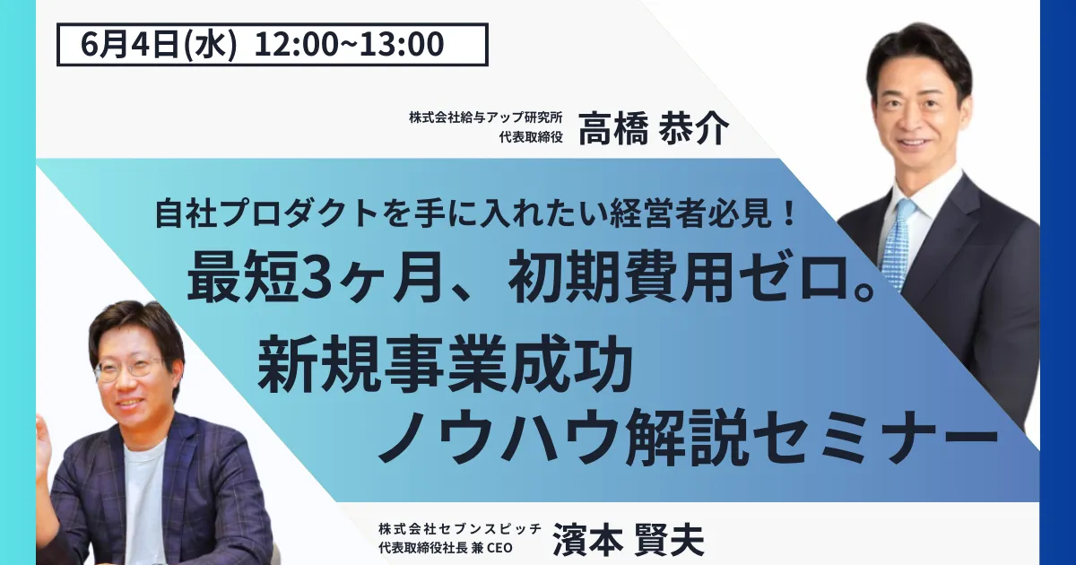 株式会社給与アップ研究所は、株式会社Seventh-Pitchと共催で、オンラインセミナーを開催します。このセミナーでは、初期費用ゼロ、わずか3ヶ月で自社プロダクトを立ち上げるための具体的なノウハウについて徹底解説します。