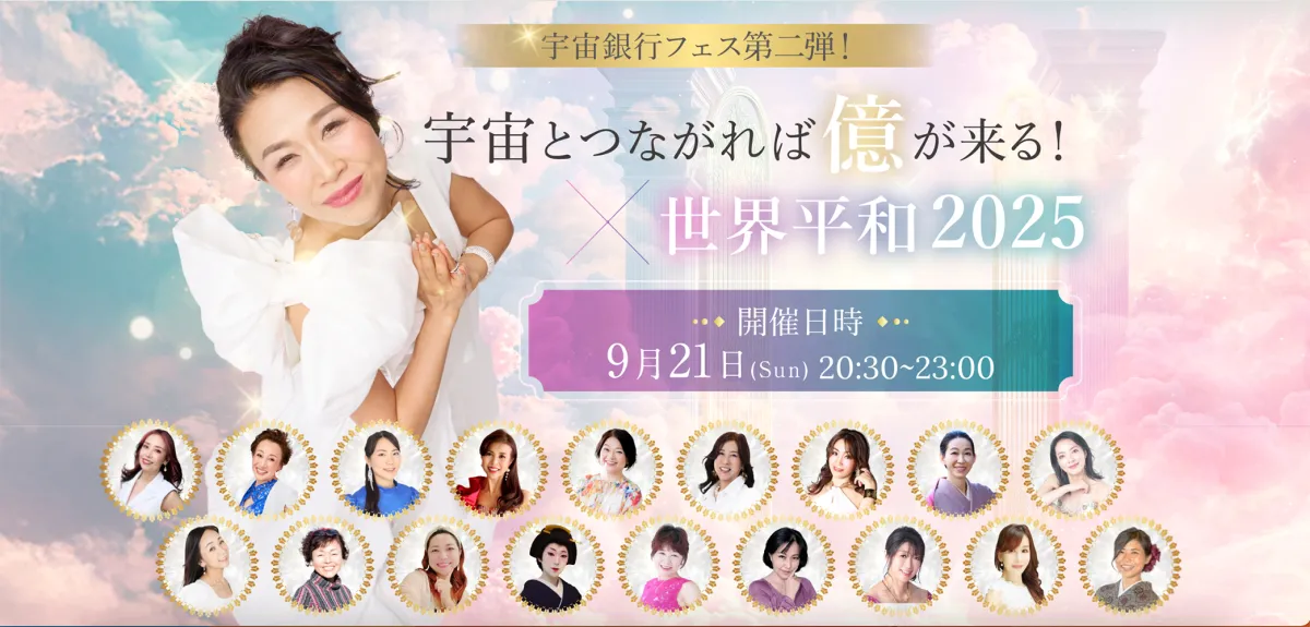 イベント名は「宇宙とつながれば億が来る!✕世界平和2025」で、2025年9月21日(日)の20:30から23:00までオンライン配信されます。参加は無料で、YouTubeやFacebookなど複数のプラットフォームからアクセス可能です。以下のリンクを活用してぜひご参加ください。