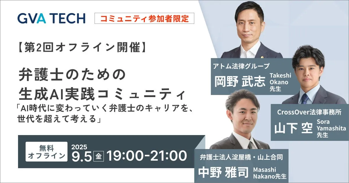 GVA TECH株式会社が運営する「弁護士のための生成AI実践コミュニティ」が、2025年9月5日(金)にオフラインイベントを開催します。本イベントは、AI技術が急速に進化する現代において、弁護士がどのようにキャリアを形成していくべきかを考えることを目的としています。