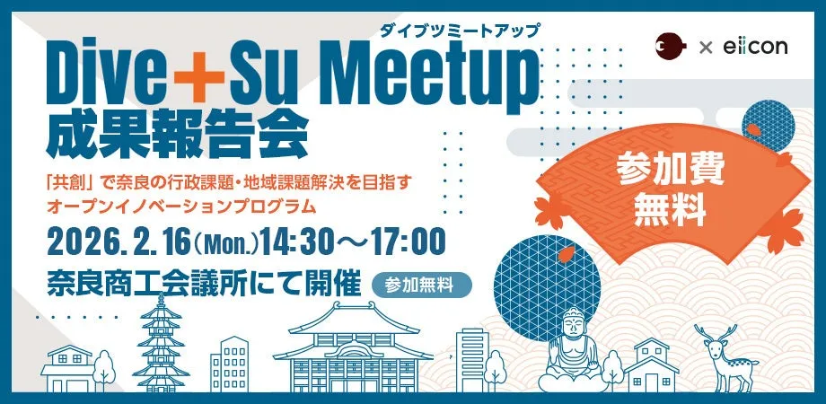 2026年2月16日、奈良商工会議所にて奈良県と株式会社eiiconが共同取り組みとして実施する地域課題解決プログラム『Dive+Su Meetup』の成果報告会が開催されます。このイベントでは、奈良県内の市町とスタートアップ企業が協力して取り組んできた9つの共創プランが発表され、その成果が広く一般に紹介されます。