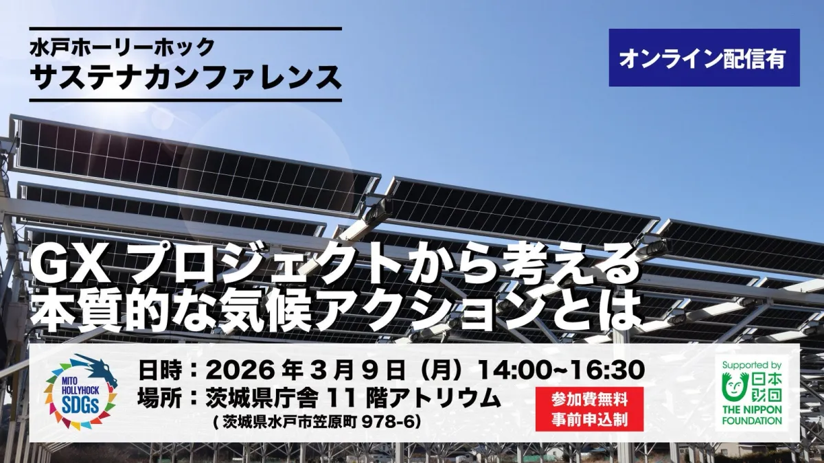 水戸ホーリーホックが推進するGXプロジェクトを中心に、持続可能な社会を築くための取り組みを探究する「水戸ホーリーホック サステナカンファレンス」が、2026年3月9日(月)に茨城県庁にて開催される。このカンファレンスは、地域共生の観点から企業や団体とともにサステナビリティ活動について考える貴重な機会となる。