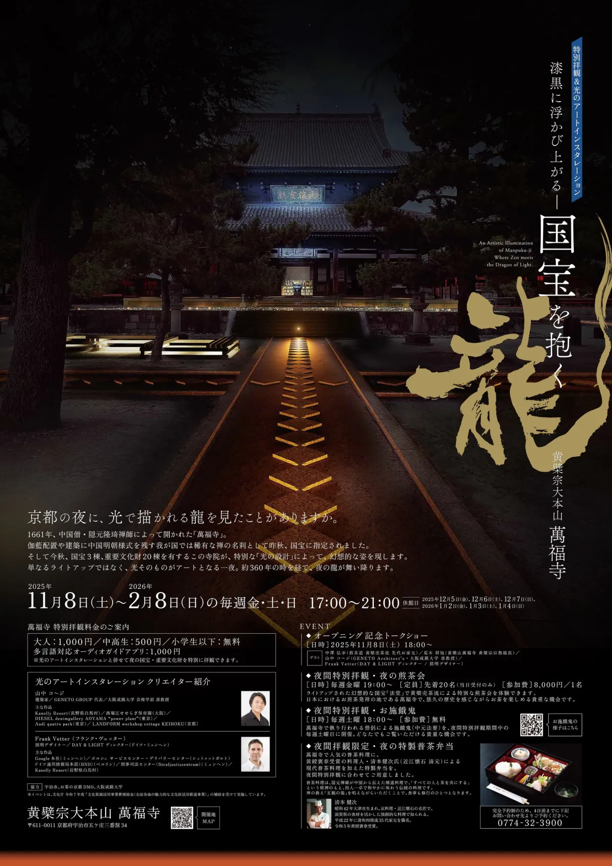 このイベントは、特別な「光の設計」によって幻想的な雰囲気を醸し出し、昼とは異なる顔を持つ萬福寺を訪れた人々に届けます。単なるライトアップを超え、光そのものがアートと化す様子は、訪れる人々に深い感動を与えることでしょう。約360年の時を経て、夜の龍が舞い降りる幻想的な空間が広がります。