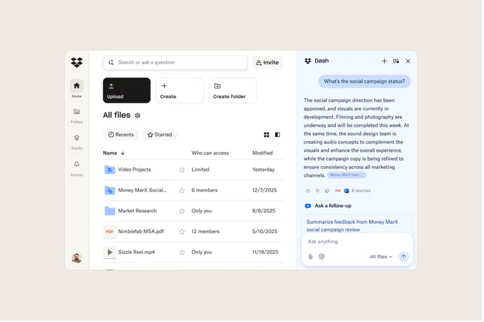 Dropbox Dashには、スマート検索、インテリジェントな整理機能、そして時短を目的とした要約機能が搭載されています。これにより、ユーザーはDropboxに保存された資料やメディアに基づいて文脈に沿った情報を取得できるようになります。また、既存のアカウントに保存されているすべてのコンテンツが学習対象となるため、利用を重ねることでDropbox Dashはより賢くなり、精度の高い検索結果を提供してくれるのです。