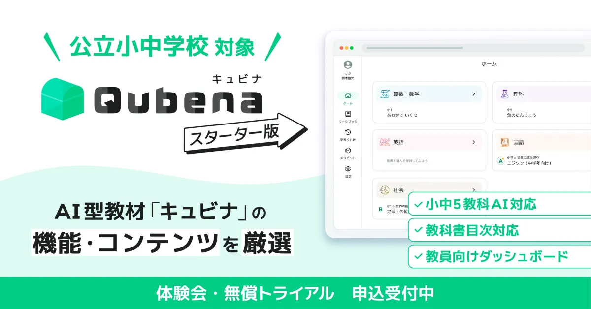 「キュビナ スターター版」は、小学校1年生から中学校3年生までの5教科に対応しており、高精度なAIによる個別最適化された出題が特徴です。具体的には、利用する教科書に合わせた学習が可能で、日々の授業に即した内容を提供することで、スムーズな学習経験を実現します。