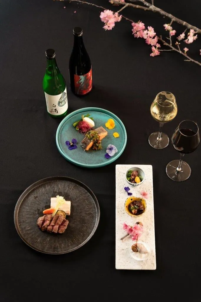 釜の音や鉄板の香りに包まれながら、細部にまでこだわりを感じる料理の数々がテーブルに並びます。さらに、各料理には厳選されたワインや日本酒がペアリングされており、より一層深みのある味わいが楽しめる設計となっています。お料理の風味を引き立たせるための選りすぐりの飲み物も用意されています。
