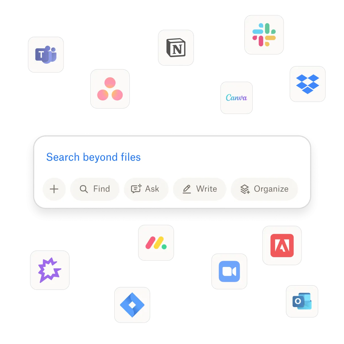 Dropbox Dashは、ユーザーが日常的に使っているさまざまなツールとのシームレスな連携が可能です。最新のアップデートにより、CanvaやJiraなど、クリエイティブやプロジェクト管理ツールとも接続でき、作業を中断せずに効率的に進められます。例えば、Dropbox Dashを使用してCanvaのデザインファイルを検索したり、Slackでの決定を確認することができるため、業務がスムーズに進行します。