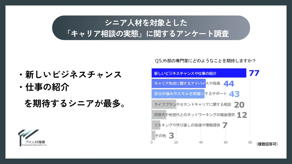最後に、外部の専門家に対する期待についても聞かれました。その結果、「新しいビジネスチャンスや仕事の紹介」が77%と非常に高い結果を示しました。他には「キャリア形成に関するアドバイスや指導」が44%、そして「自分の強みやスキルを明確にするサポート」が43%でした。これらの期待が示す通り、シニア層はアドバイス以上の具体的な支援を求めています。