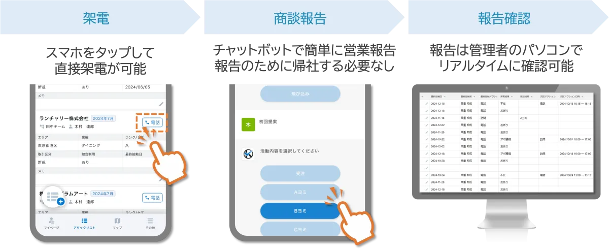 KaitakuCloudは、特に人材業界の新規開拓を目的とした営業支援ツールです。これは、過去に人材業界での営業に携わってきた経験者たちによって設計されており、タスク管理からチャットボットでの営業報告、さらには架電まで、スマートフォン一つで簡単に操作が可能です。これにより、営業情報がデータとして蓄積され、タスクの漏れを防ぎつつリアルタイムで進捗を把握できます。新規開拓の生産性を高めるために設計されたこのツールは、業界内での競争力を向上させる助けになります。