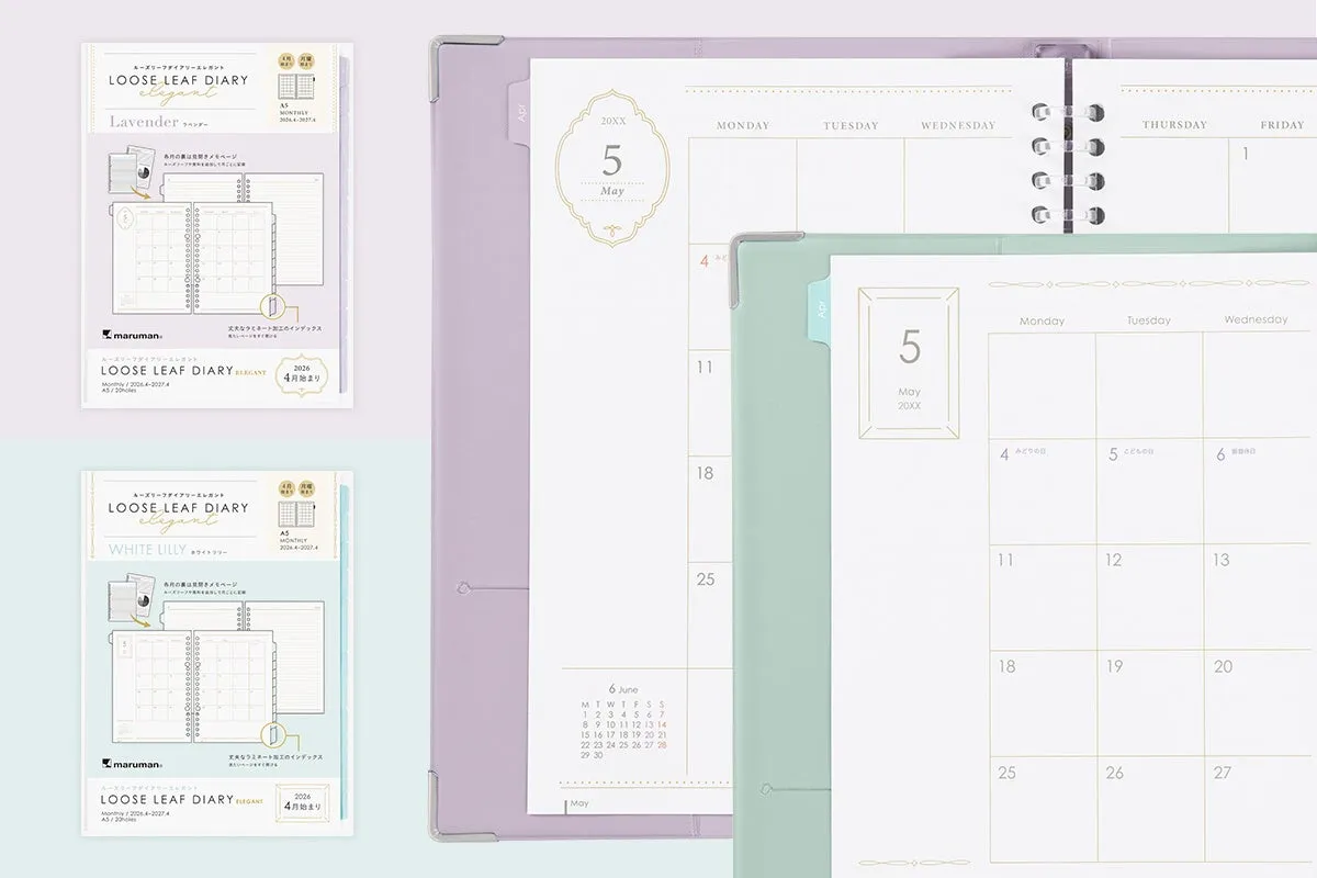 『ルーズリーフダイアリーエレガント』は、花をテーマにした品のあるカラーでデザインされており、各罫線には装飾が施されています。丈夫なラミネート加工のインデックスが付いているため、必要なページにすぐアクセス可能です。月別の記録も簡単にできるデザインとなっており、1,650円(税込)で購入できます。