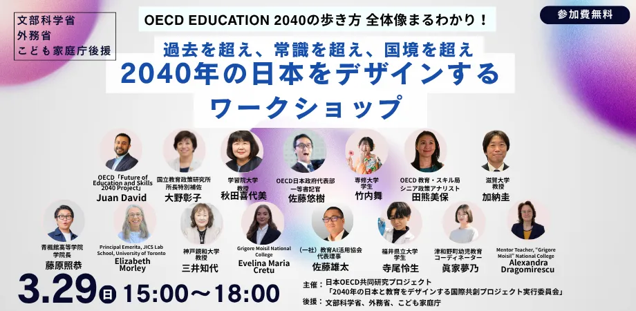 2026年3月29日、教育の未来をデザインするための国際的なオンラインワークショップ「OECD Education 2040の歩き方 全体像まるわかり!」が開催されます。このイベントは、OECD Education 2040プロジェクトのさまざまな実践者が集まり、より良い未来に向けた教育のあり方を共有し、議論する場です。