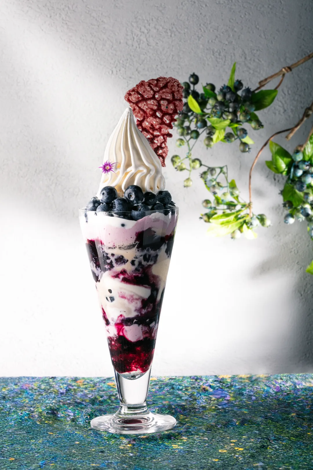 『Purple Sapphire』の美味しさは、色とりどりの食材の層が生み出すハーモニーにあります。グラスの上には、クリーミーなクレミアソフトクリームが中央に鎮座し、外側にはカシスのチュイルがトッピングされています。その下には、甘酸っぱいブルーベリーがふんだんに盛り込まれたブルーベリーシャンティークリームがあり、ラベンダーの香りが心地よく広がります。さらに、ブルーベリーとラベンダーのジュレや、紅茶のアイスクリーム、ブリュレクリームなどが重なることで、非常に多層的な味わいが楽しめる。