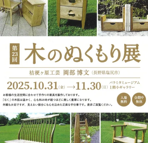 2025年10月31日から11月30日の期間で、パラミタミュージアムにて「第23回 木のぬくもり展」が開催されます。この展覧会では、長野県塩尻市の職人、岡部博文氏の手づくり家具が展示されます。無垢の木材を使用した家具は、その温かさと美しさが特徴で、訪れる人々に深い感動をもたらします。