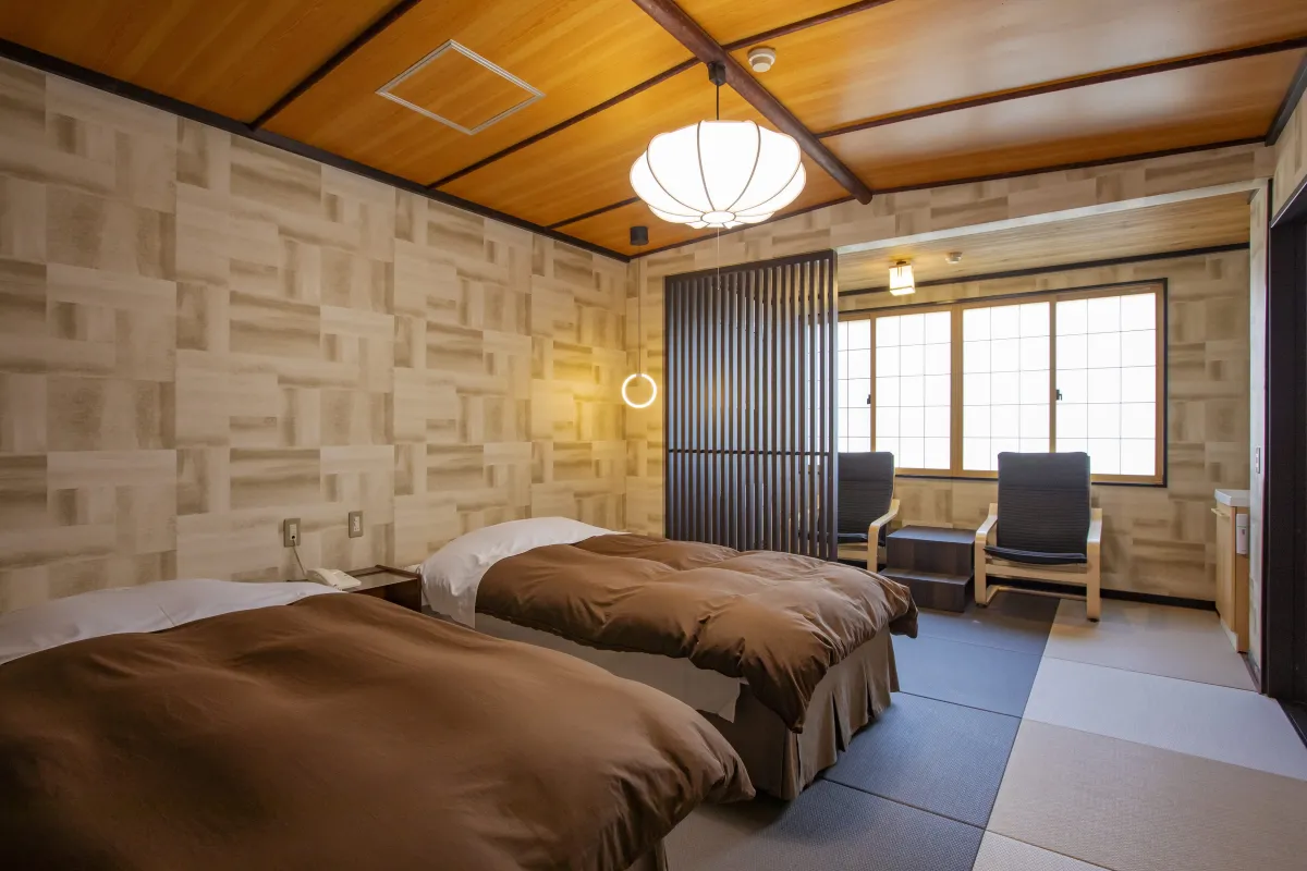 また、壁面には和紙調の模様が施され、木製の格子やモダンな照明器具が調和するデザインです。畳敷きの寛ぎスペースと快適なベッドルームが一体となることで、伝統的な和の空間が現代的な快適性と見事に融合しています。