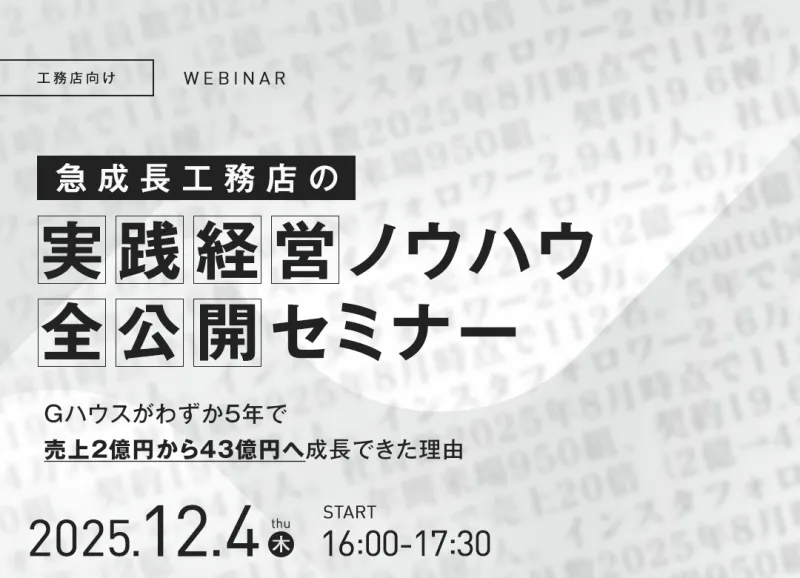 住宅業界の厳しい市場環境下で急成長を遂げた株式会社Gハウスが、株式会社SUMUSと共催でオンラインセミナーを開催します。このセミナーは、驚異的な成長を実現したGハウスの経営ノウハウを徹底的に学べる貴重な機会です。