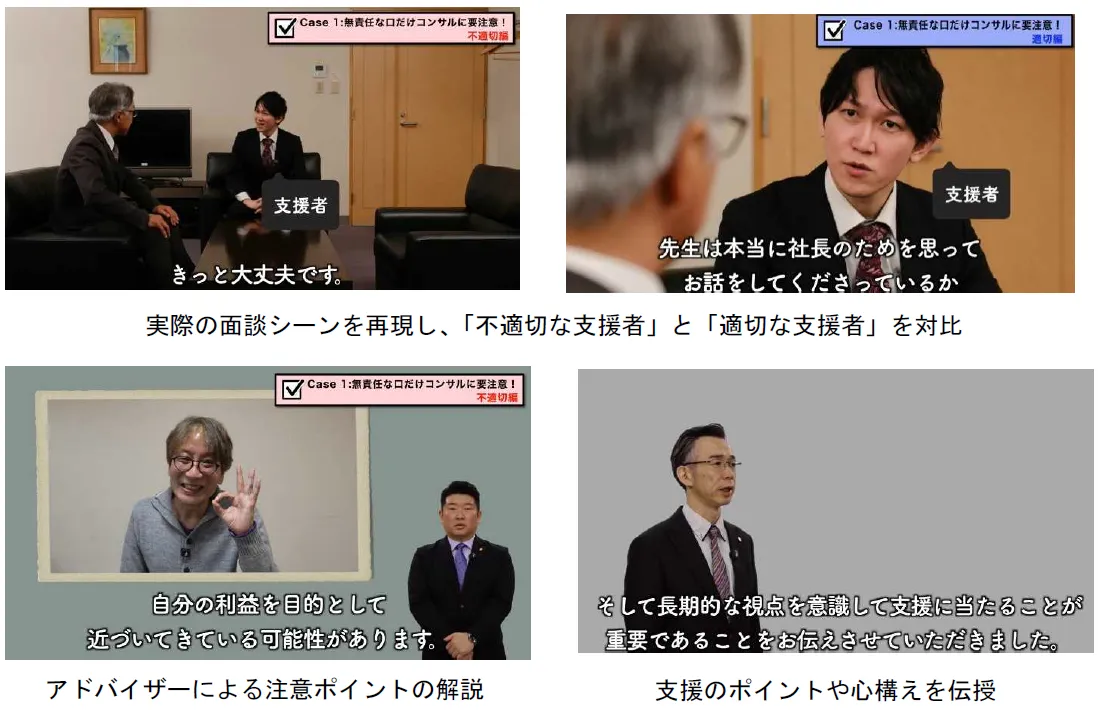 今回の教材では、M&Aを進める際に気を付けるべきポイントが整理されています。4つの具体的な支援ケースを用いて、支援者が円滑に支援や交渉を進めるために必要な知識を提供します。特に、適切な支援者の在り方や不適切な対応について、面談シーンを通じて具体的に学ぶことができます。
