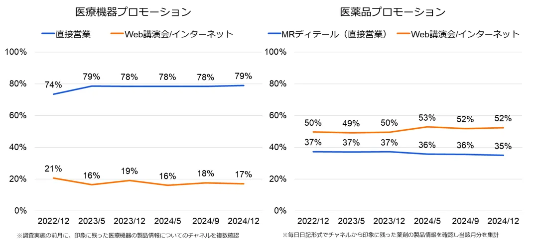 今回の調査は、医師の働き方改革が施行された後、3回目の調査でもあり、医療機器に関するプロモーションのチャネルや時間帯に大きな変化は見られませんでした。しかし、製薬企業の「MRディテール」においては減少傾向が見受けられるため、医療機器の分野では対面販売や直接営業の重要性が依然として高いことが浮き彫りとなりました。医師が医療機器の情報を効果的に取得できるよう、引き続き様々なチャネルが活用される必要があります。