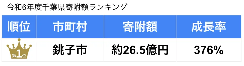 銚子市は寄附額がわずか約3億円だったのが、パンクチュアルの支援開始からたった2年間で約26.5億円に急成長し、千葉県内では堂々の1位を獲得しました。これにより、県内のシェアを見事に拡大し、地域の活性化に寄与しています。