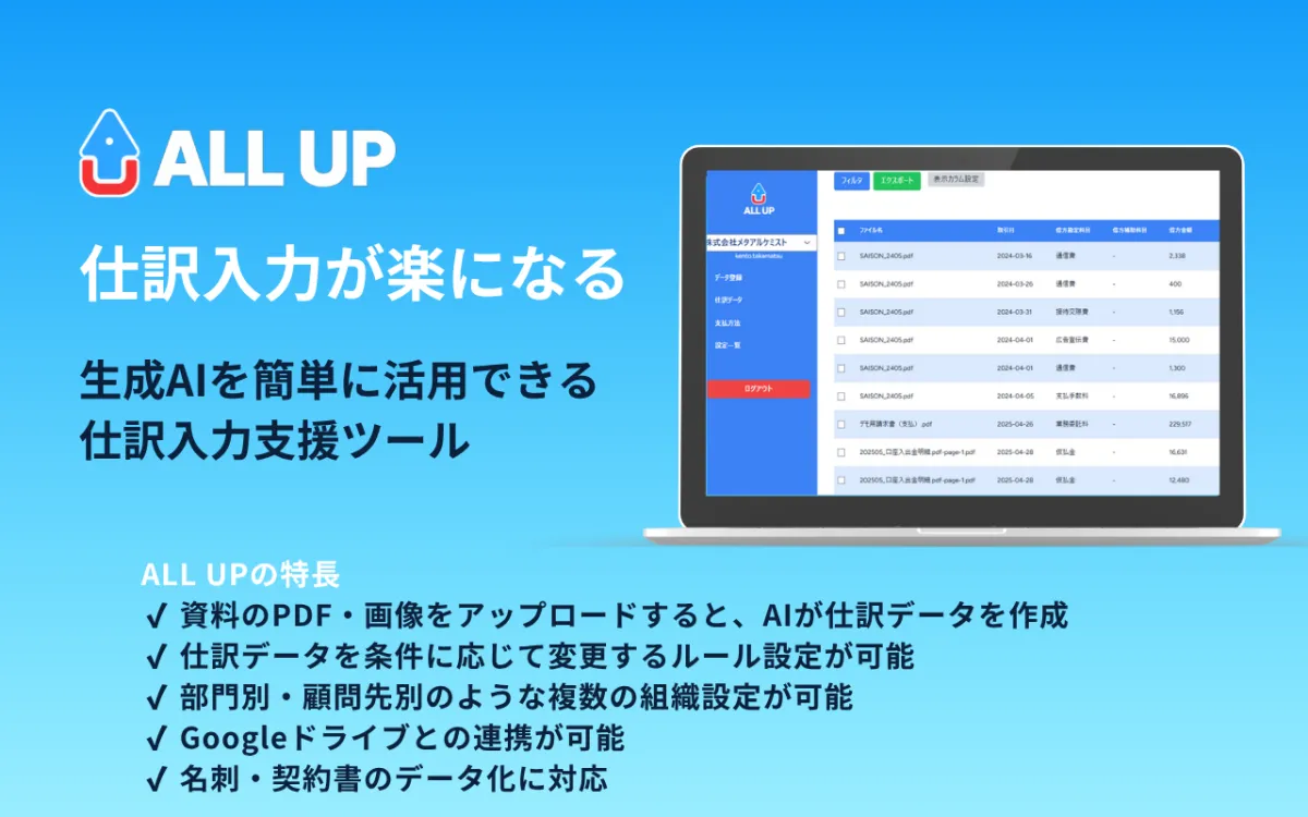 メタアルケミスト株式会社が発表した新たなクラウドツール「ALL UP」は、生成AIを活用し、経理関連資料を迅速に仕訳データ化します。このツールのベータ版が2025年9月30日まで利用可能となり、無料モニターを募集しています。今後の経理業務の効率化に大きな期待が寄せられています。