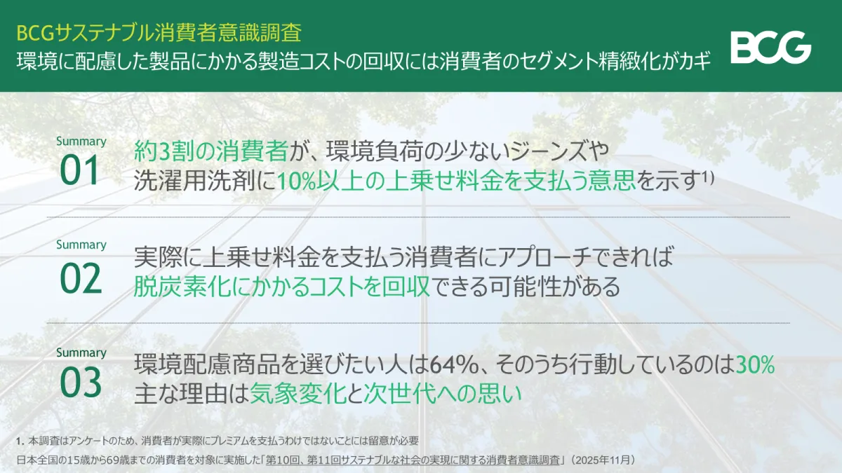 この調査は、サステナブルな社会の実現を目指した消費者の行動変容を定定期的に観測することを目的としており、2021年から開始されました。BCGは、環境に配慮した商品の需要がどのように変化しているかを見極めるために、2025年にかけて複数回の調査を予定しています。