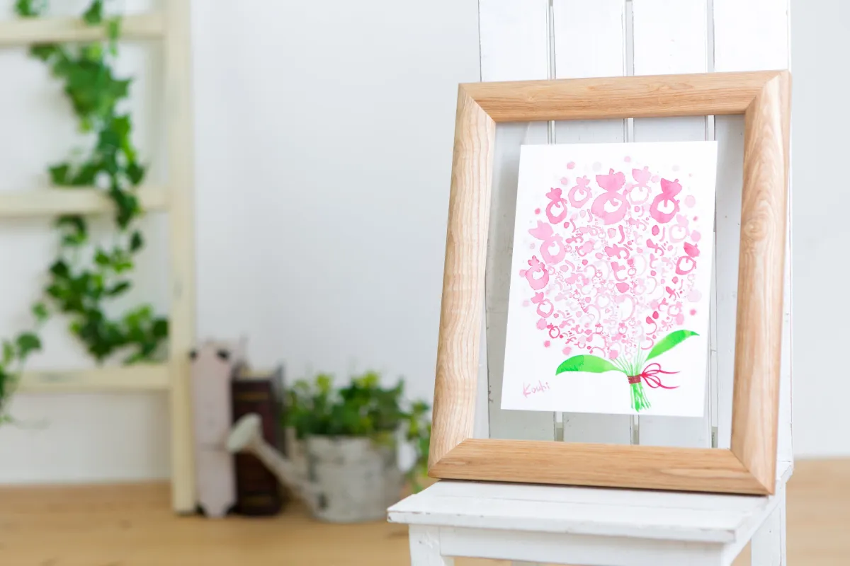『ありがとうの花束』の価格はサイズによって異なりますが、特別製の額に入れて提供されます。これは北海道産のタモ材を使った職人による手作りです。