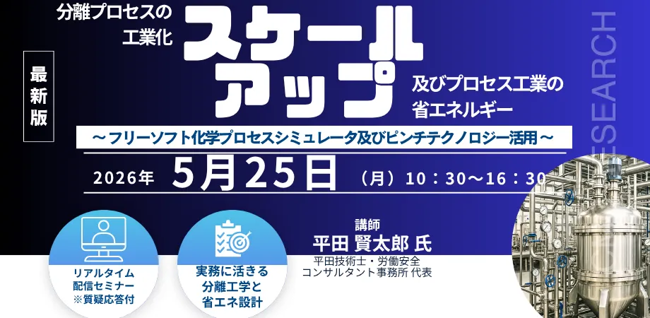 2026年5月25日(月)、化学プロセスの専門家を対象とした特別なライブ配信セミナーが開催されます。当セミナーのテーマは「分離プロセスの工業化スケールアップ及びプロセス工業の省エネルギー」で、フリーソフト化学プロセスシミュレータとピンチテクノロジーの活用法を中心にお届けします。