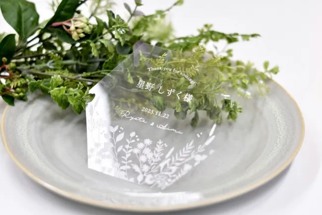 この商品は、ゲストが安心して結婚式に参加できるよう、飛沫対策として活用できるアイデア商品です。使い方は簡単で、受付でひとつずつ配布する方法や、席札としてテーブルに並べる方法があるため、アレンジの幅も広がります。オシャレさと機能性を両立しており、透明なフィルムにスタイリッシュなデザインが施されていることで、安心感を与えるだけでなく、素敵なアクセントになるでしょう。