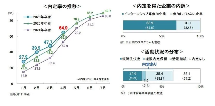 調査によると、2026年卒業予定の学生の内定率は64.9%となっており、前年同期の62.8%を上回る結果となりました。内定を得た学生は全体の約24.6%で、既に就職活動を終えた人々が一定数存在することもわかります。しかし、全体の約70.5%が活動を続けていることから、多くの学生が引き続き専門分野や志望企業を探し続けています。