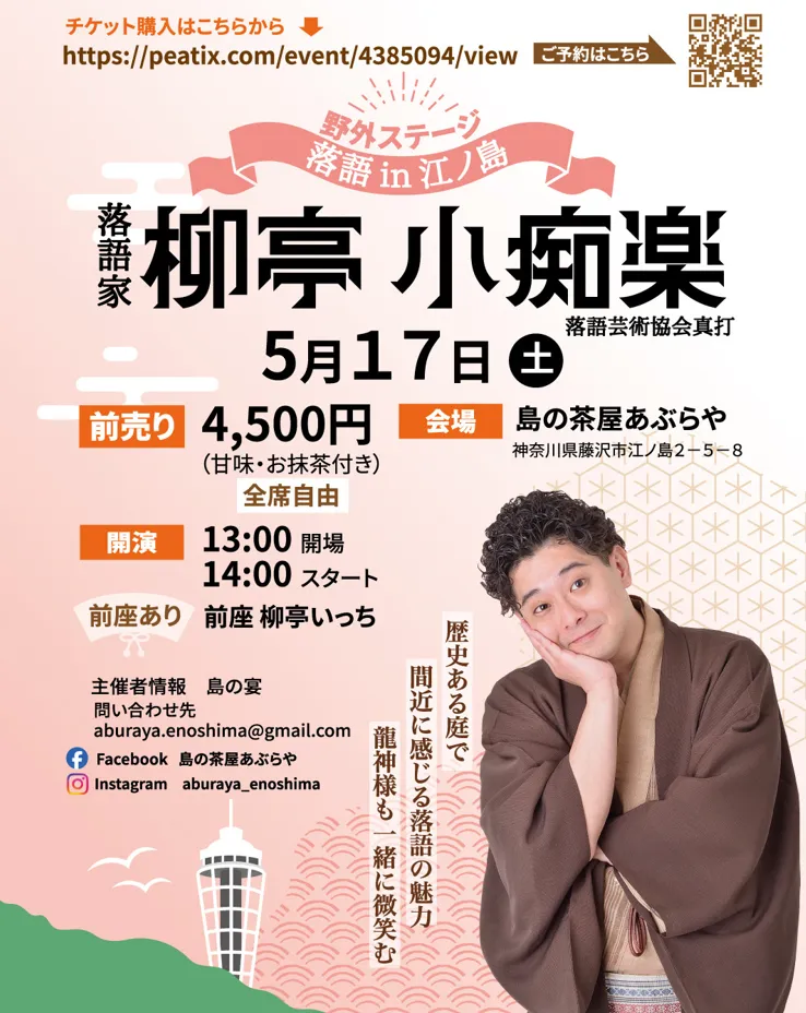 ぜひ、この貴重な体験をお見逃しなく。心温まる落語とともに、江の島の美しい景観を楽しむ贅沢なひとときをお過ごしください。