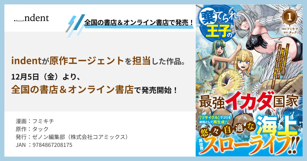 作家と企業をつなぐ創作プラットフォーム「Nola」を運営する株式会社indentが、原作エージェントとして手がけた新しい作品『棄てられ王子の最強イカダ国家 〜お前はゴミだと追放されたので、無駄スキル【リサイクル】を使ってゴミ扱いされたモノたちで海上都市を築きます〜』が2025年12月5日(金)に全国書店とオンライン書店で販売開始されます。この作品は、タックによる原作とフミキチによる漫画で構成され、人気のあるレーベル「ゼノンコミックス」から出版されます。