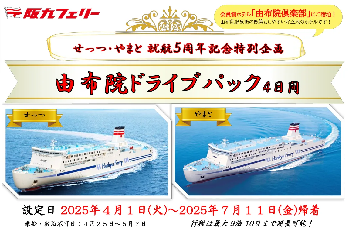 関西の拠点から九州へのアクセスを提供する阪九フェリーが、今年5周年を迎えました。これを記念して、特別な「由布院ドライブパック」が販売開始です。このプランは、2025年4月から7月までの期間で、大阪の泉大津港または兵庫の神戸六甲アイランド港から出港するもので、特別な宿泊体験を提供します。