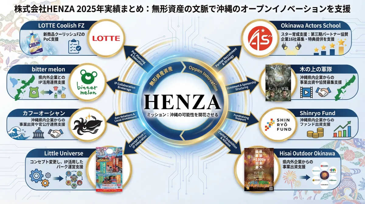2025年、株式会社HENZAは沖縄を拠点に、新たなビジネスモデルの創出に向けた数々のプロジェクトを展開しています。無形資産を核としたオープンイノベーションの支援を行い、地域の企業や団体と連携した多様な取り組みを進めています。これにより、沖縄の可能性を国内外に広げることを目指しています。