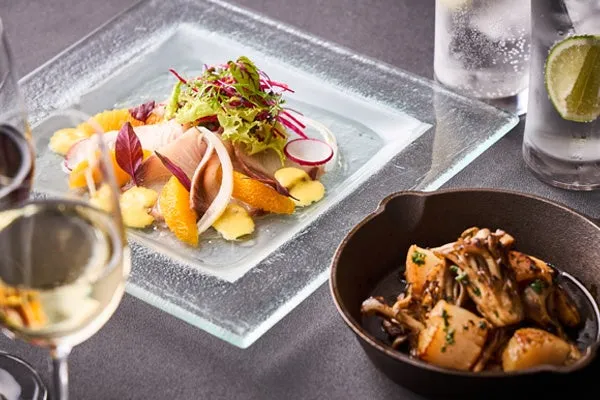 旬の「北陸産鰤」は、その濃厚な旨みとプリッとした食感が魅力。シンプルにカルパッチョとして提供され、オレンジやビーツを添えたサラダ仕立てで楽しむことができます。柚子をアクセントにしたオレンジソースが味を引き立てます。