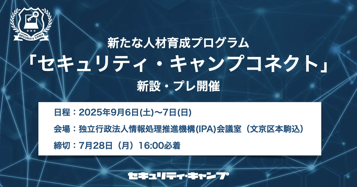 「セキュリティ・キャンプコネクト」が発表されました。このプログラムは、独立行政法人情報処理推進機構(IPA)と一般社団法人セキュリティ・キャンプ協議会によって実施されます。プレ開催が2025年9月6日から7日まで東京で行われ、参加者の募集は2025年7月9日より始まります。
