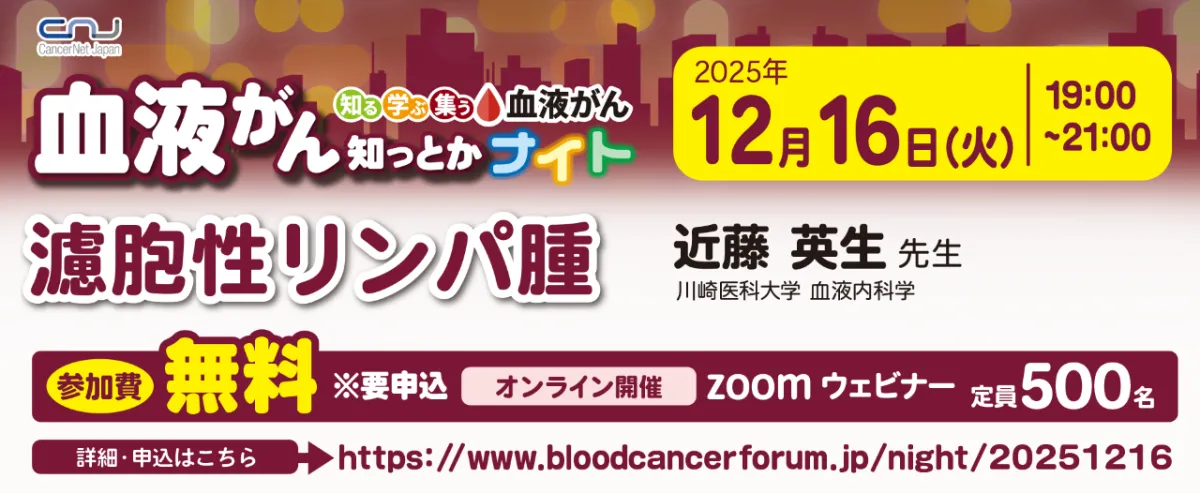 認定NPO法人キャンサーネットジャパンは、血液がんに関するオンラインセミナー「血液がん知っとかナイト」を開催しています。2025年の12月に行われる第22回目のセミナーでは、「濾胞性リンパ腫」をテーマにしています。参加者はインターネット環境さえあれば、全国・海外問わず参加が可能で、セミナーは無料で提供されています。