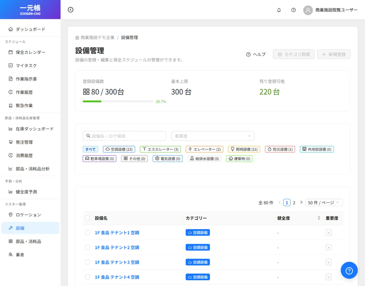 - - 保全活動や修繕履歴、業者、部品、担当者情報などを一元化