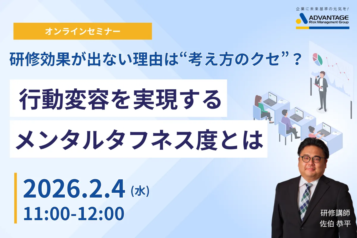 株式会社アドバンテッジリスクマネジメントは、2026年2月4日に人事・労務およびメンタルヘルス担当者向けに、Webセミナー「研修効果が出ない理由は“考え方のクセ”? 行動変容を実現するメンタルタフネス度とは」を開催します。このセミナーでは、企業が直面する「研修を実施しても社員の行動変容が実現しない」という問題に切り込み、その背後に潜む「考え方のクセ」を解明します。