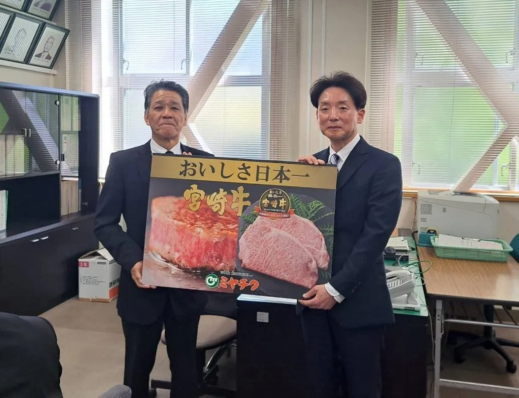 贈呈式では、(株)ミヤチクの常務取締役、池上和弘氏と、同高校の校長、河野浩幸氏が並び、温かい雰囲気の中で行われました。贈呈された宮崎牛は、後日全校生徒や職員に牛丼として振る舞われる予定です。