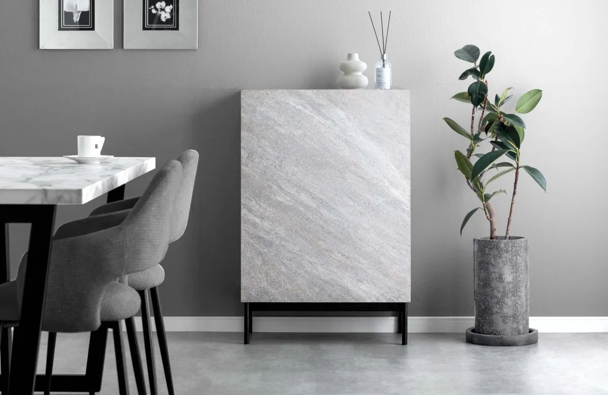 カラーバリエーションにはストーングレーとストーンブラックの2色があり、いずれも粉体塗装したスチール製の脚部が特徴です。これにより、モダンやモノトーンなインテリアにも自然に溶け込み、背面も美しくデザインされているため、部屋の中央に置くこともできます。