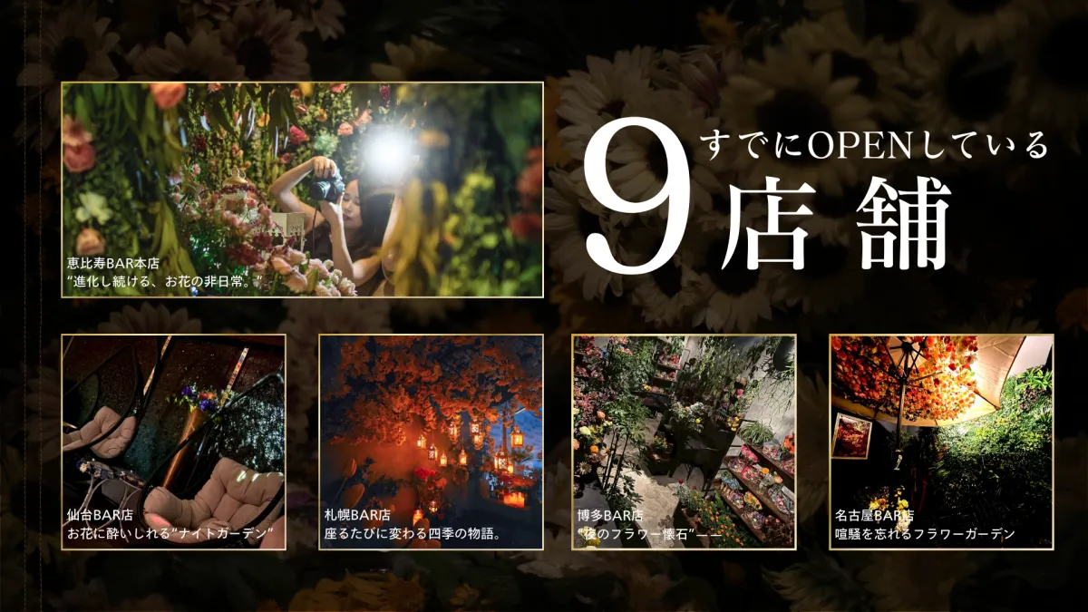 東京の恵比寿では、月替わりの花を間近に楽しめる新しい体験が提供され、大阪梅田の店舗では記念日や女子会にぴったりな華やかな空間が演出されています。また、名古屋久屋大通では、イベントに最適な「ナイトフラワーガーデン」としてのテイストが強化されています。