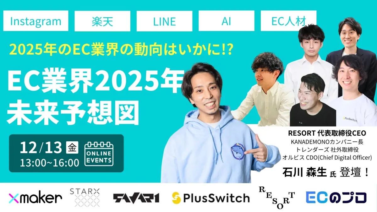 2024年12月13日、株式会社RESORTの代表取締役CEOである石川森生氏が、EC業界の未来についてのセミナー「EC業界2025年未来予想図」に登壇します。このイベントは株式会社Xmakerとムジン株式会社の主催で、無料で参加できる特別な機会です。