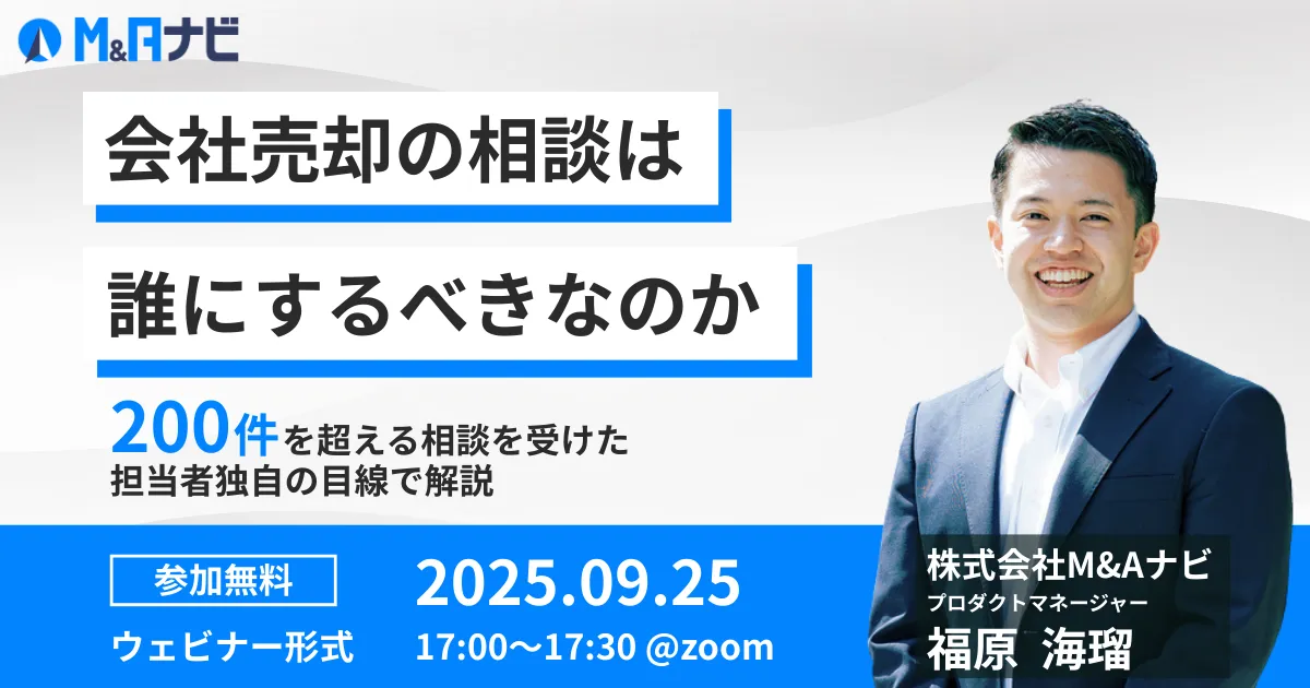 株式会社M&Aナビが主催する無料セミナー「会社売却の相談先は誰にするべきなのか」が、2025年9月25日(木)17時より、オンライン(Zoom)形式で開催されます。このセミナーは、会社売却を検討している中小企業のオーナー経営者を対象に、信頼できる相談先を見つけるための情報を提供するものです。