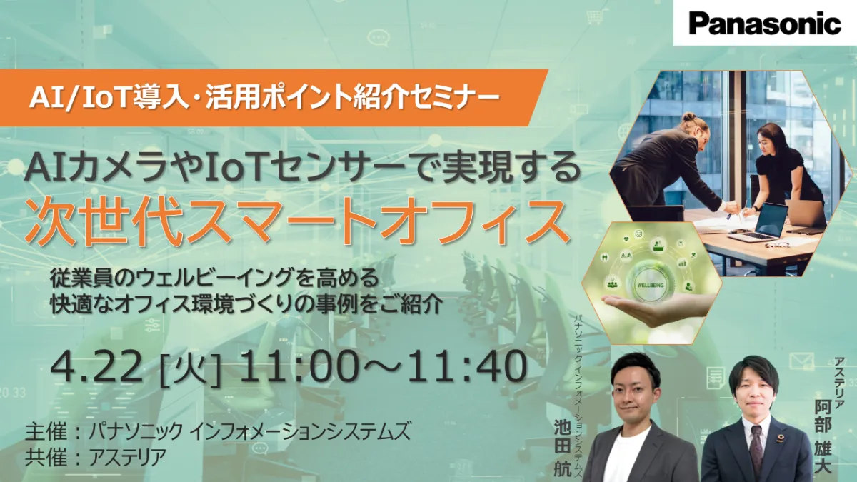2025年4月22日(火)、パナソニック インフォメーションシステムズ株式会社主催のウェビナー「AI/IoT導入・活用ポイント紹介セミナー」がオンラインで開催されます。このセミナーでは、最新のAIカメラやIoTセンサーを駆使して実現する次世代スマートオフィスの事例とともに、快適で生産的なオフィス環境を作り出すためのポイントが紹介されます。