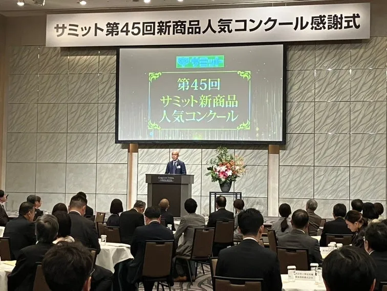 2025年2月25日、サミットはセルリアンタワー東急ホテルにて第45回『サミット新商品人気コンクール』の感謝式を開催しました。このイベントでは、昨年に発表された新商品から選ばれた優れた商品に対する感謝の気持ちを表し、入賞企業およびお客様モニターが一堂に会しました。