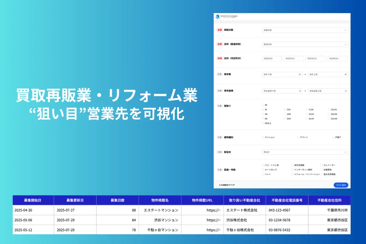 使用者が簡単な条件を入力するだけで、使い慣れたExcel形式のリストが生成されます。これにより、不動産業界に新たに参入した企業でもスムーズに活用できます。
