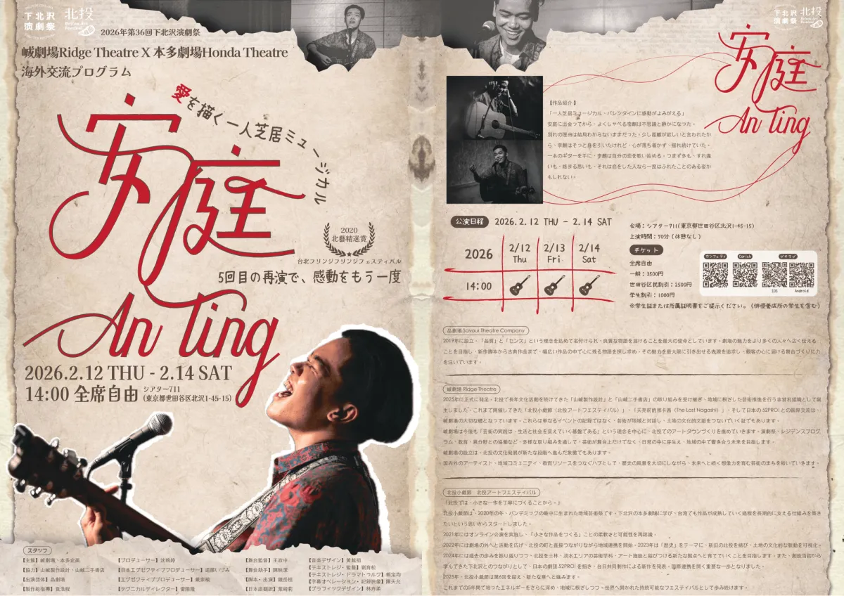 2026年2月12日から14日まで、シアター711で開催される下北沢演劇祭において、台湾の峸劇場(Ridge Theatre)が主催する一人芝居ミュージカル『安庭』(アンティン)が上演されます。